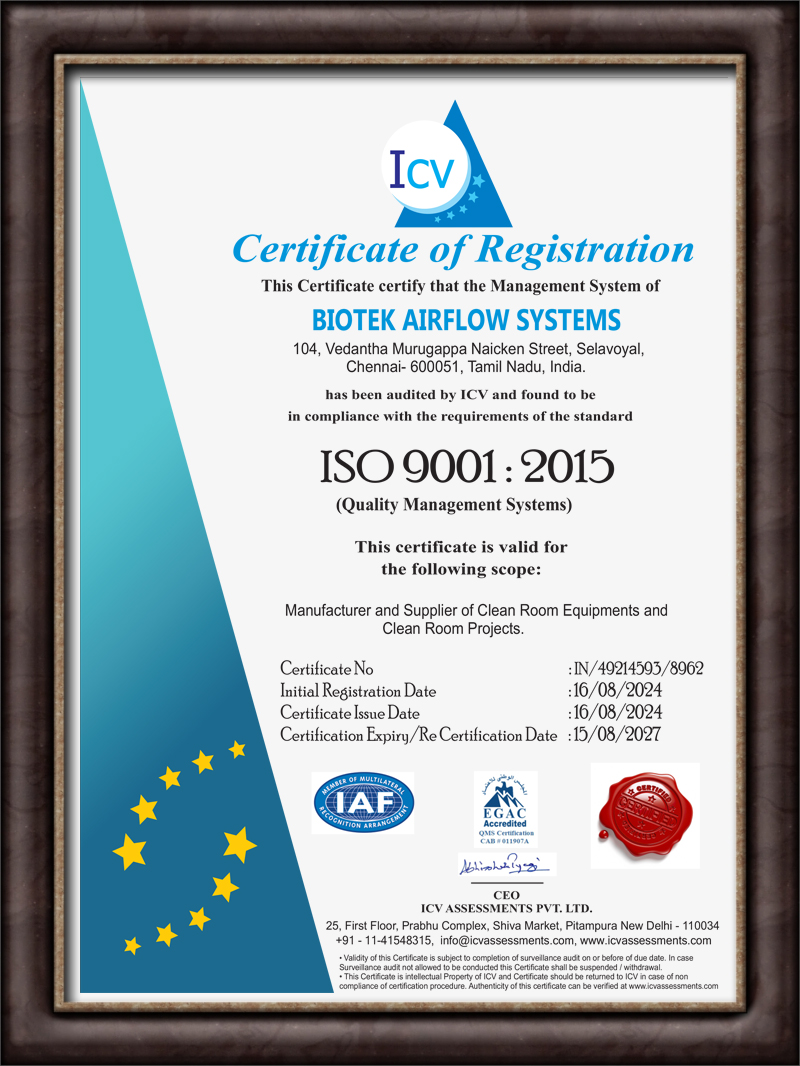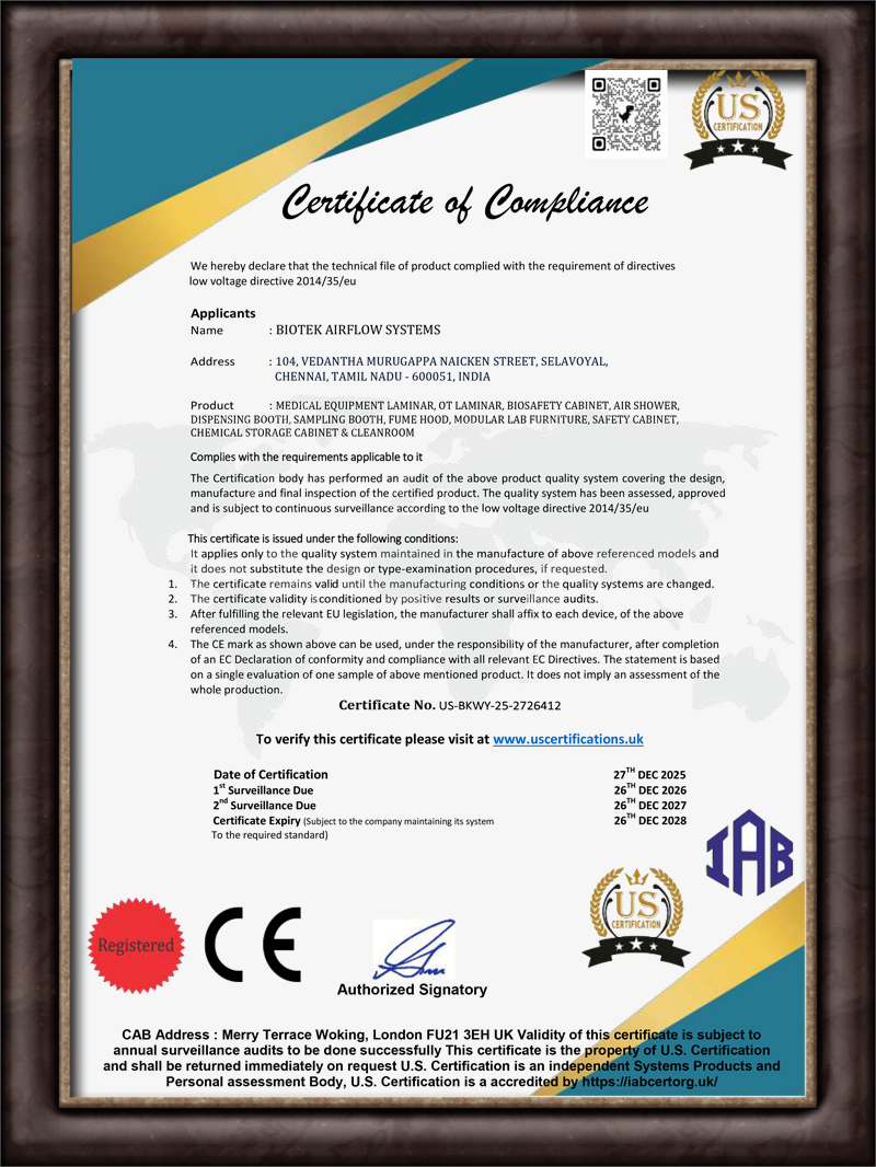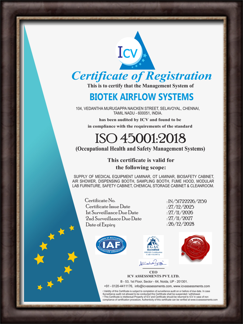 Biotek Airflow Systems is one of the reliable manufacturer and supplier of superior quality products. We are based as a Partnership Company and situated our head at Chennai. We are affianced in offering General Lab Instruments, Chemistry Lab Apparatus, Lab Table, Analytical Instruments, Concrete Testing Instruments, Lab Storage Cabinet and more. Further, we also execute Clean Room OT Service, Cleanroom Microbiology Service, Cleanroom Ceiling Service, Cleanroom Installation Service and more. We adhere to the strict policy on quality of the products. We manufacture modular Laboratory furniture based on the specific requirement of the customers. We assure highest level of quality and safety while working with harmful and toxic substances.